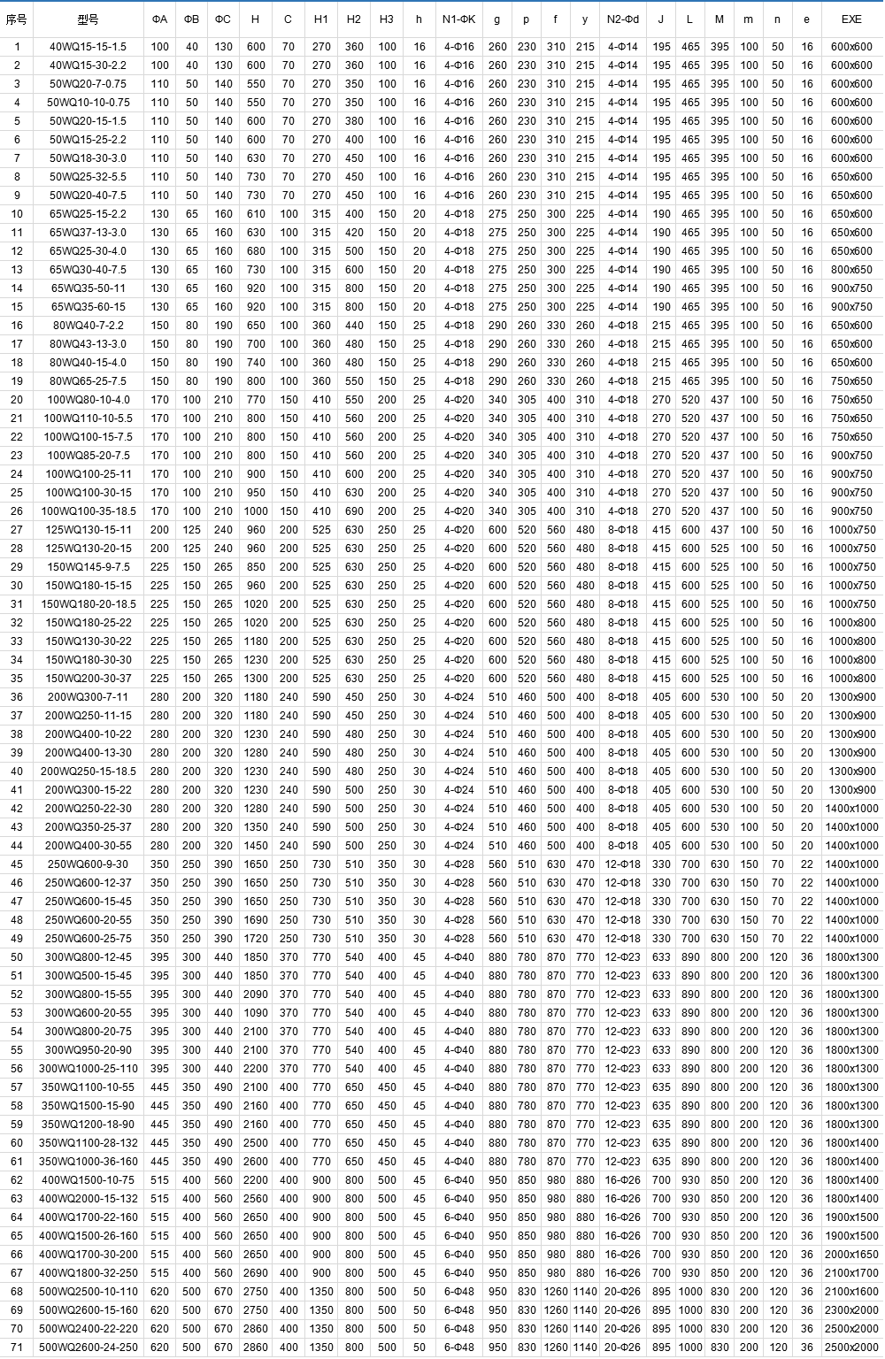 WQ型污水污物潛水泵是目前國(guó)內(nèi)較先進(jìn)與理想的排水機(jī)具。該泵采用旋流式的下吸結(jié)構(gòu),具有不怕堵塞,耐磨損、運(yùn)行可靠、維修方便、排水徹底,適用范圍廣泛等突出優(yōu)點(diǎn),較好解決了PN濃漿泵不能抽吸重量較大的顆粒以及PW、PWA污水泵易堵塞的難題。